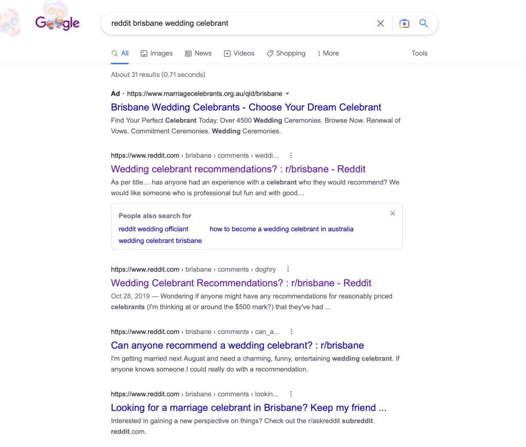 Just say you were trying to be found on the boring “Brisbane wedding celebrant” search term. What happens if you drop the word Reddit in front of it? Are you there? Are you active on Reddit?