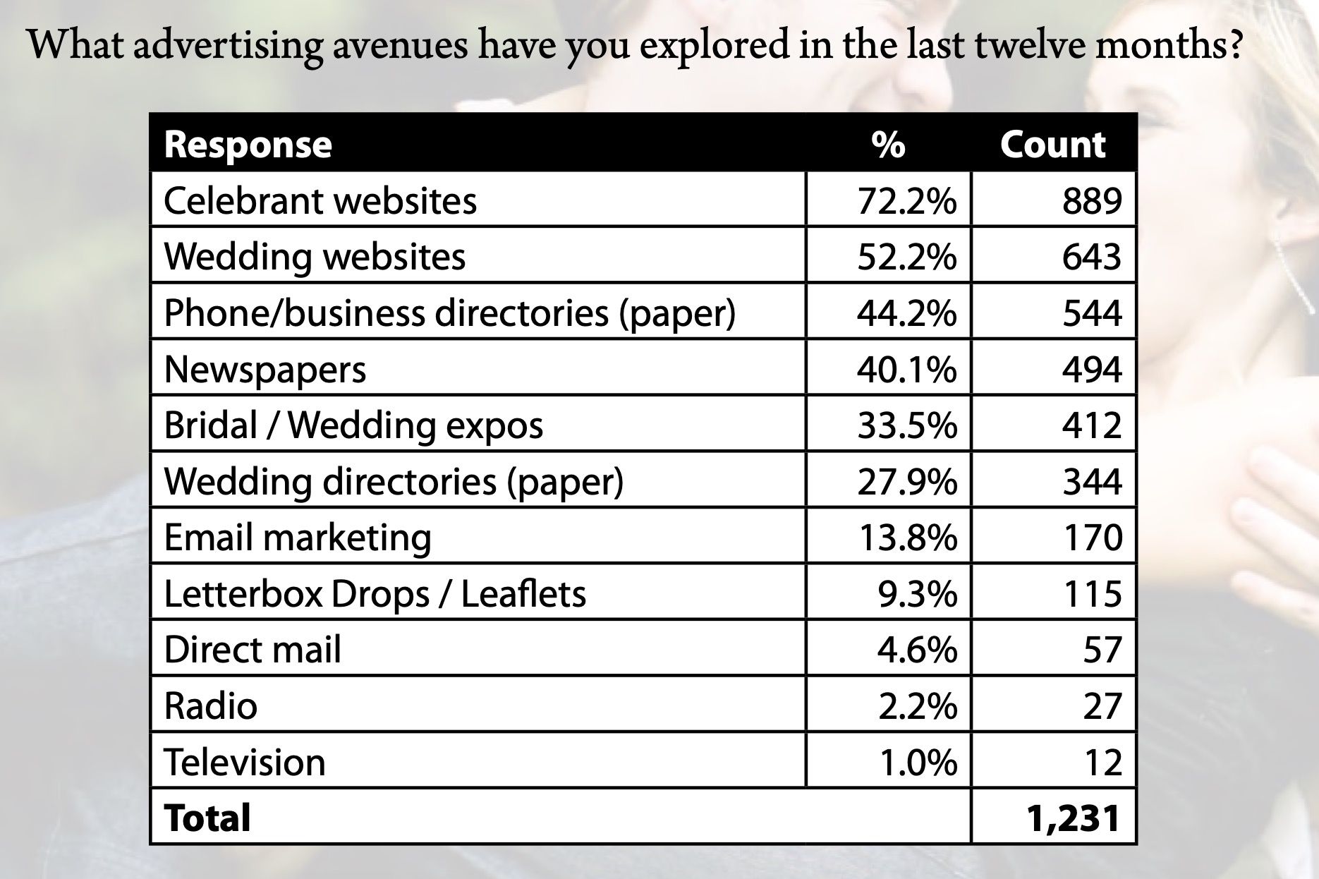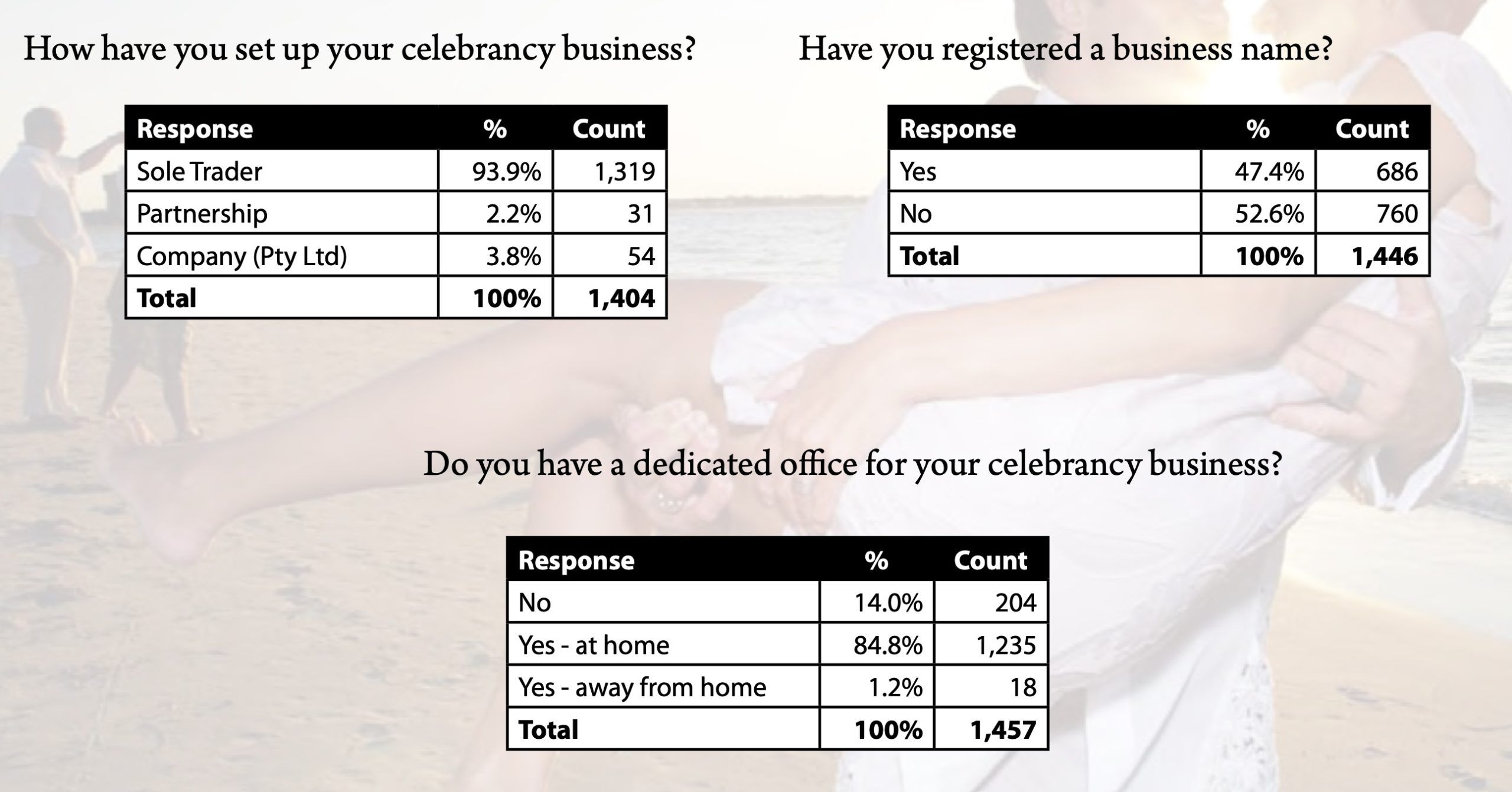 11 years ago (in 2009), celebrant directory website Celebrante, conducted a survey of about 1400 celebrants. I’m cleaning out my Dropbox folder and found the survey, so I thought it’d be an interesting piece of quarantine content for us all while we’re busy doing not a whole lot in regards to weddings.