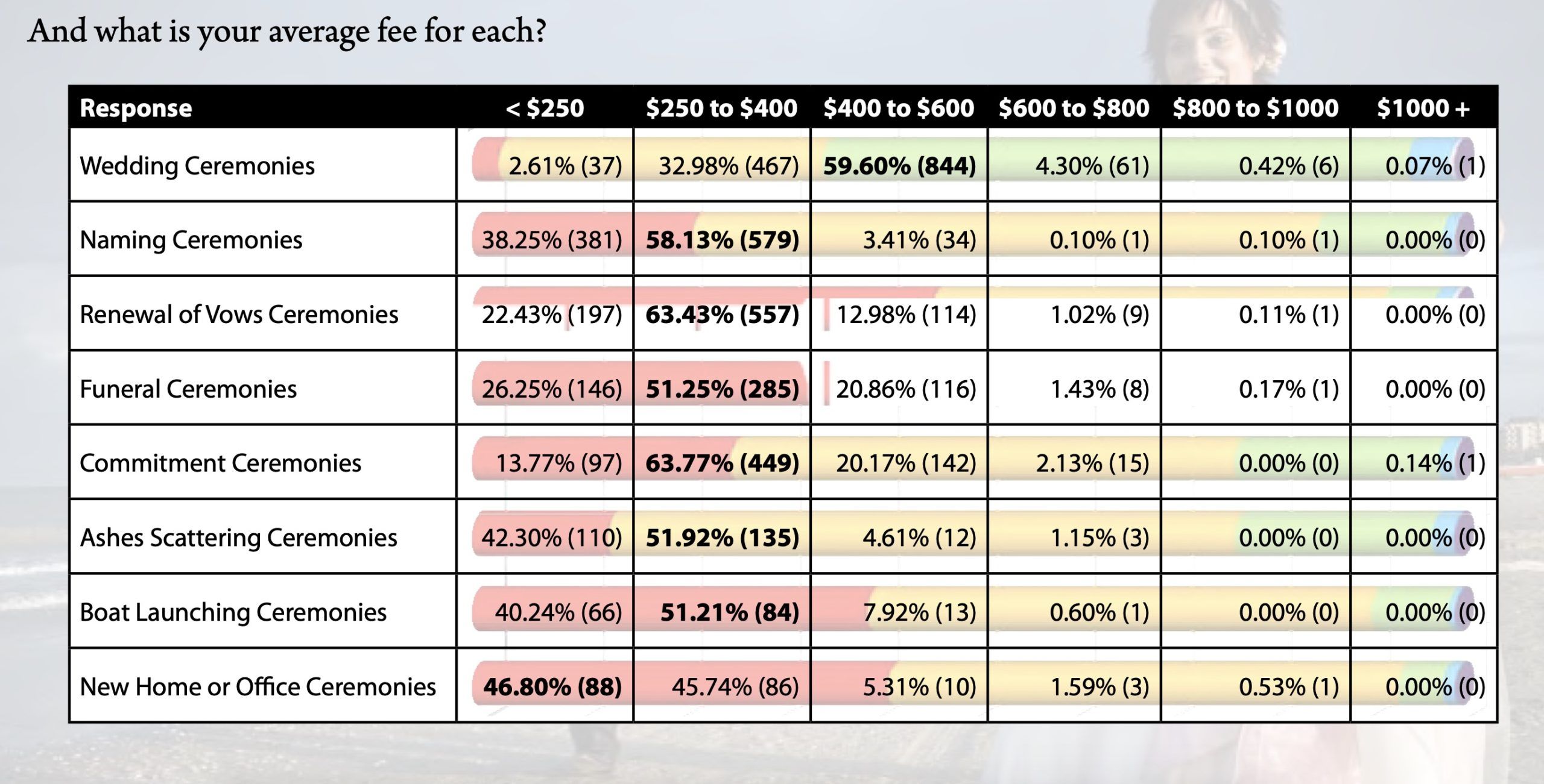 Only one celebrant that responded to the survey charged more than $1000 and most were in the $400 to $600 range.