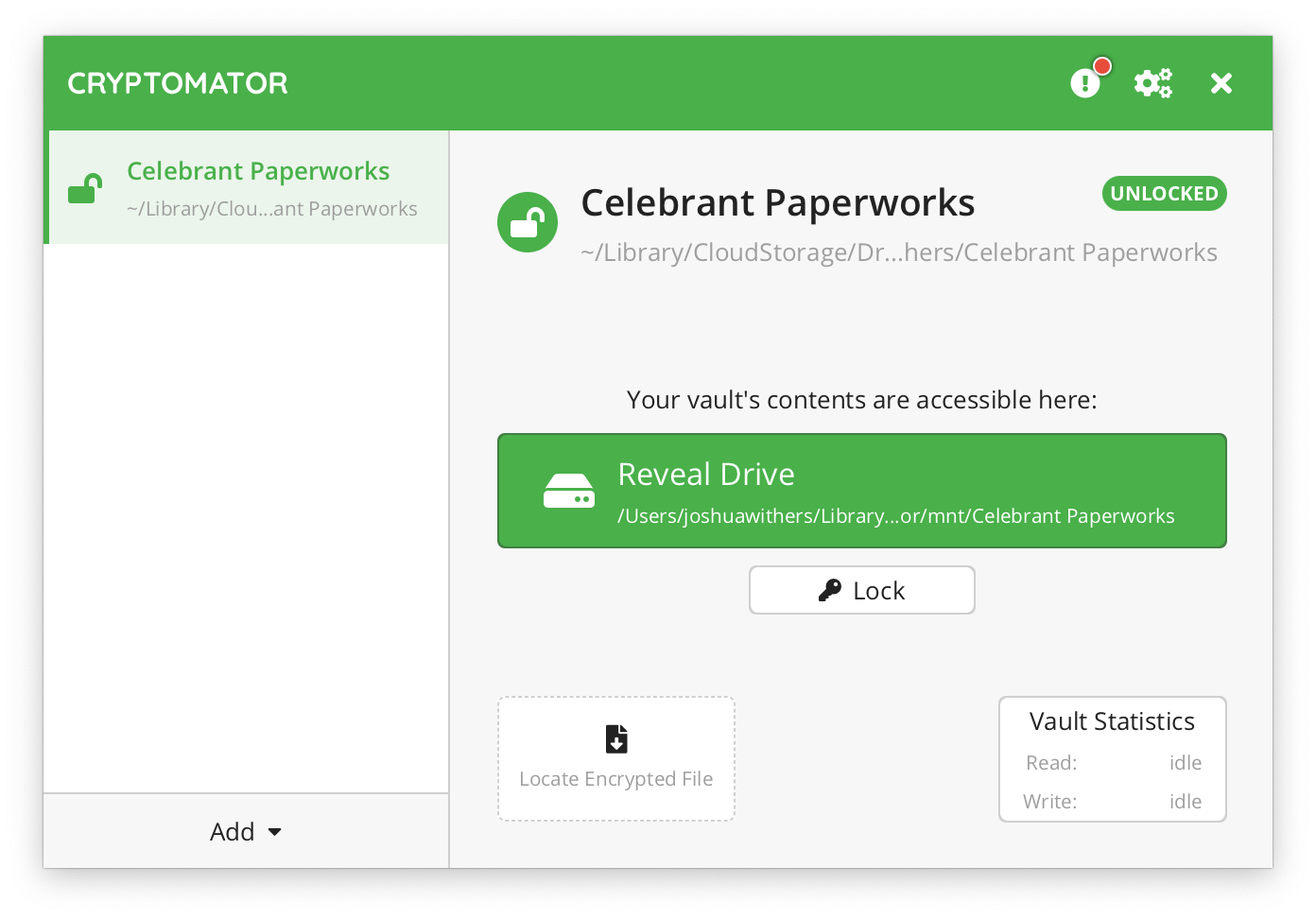 To access your files in the vault you’ll need to decrypt them, you do this by opening the Cryptomator app and unlocking it, entering your password, and you’ll find a new virtual (not-physical) drive attached to your computer. Now you’ve got access to all the files inside the vault.
