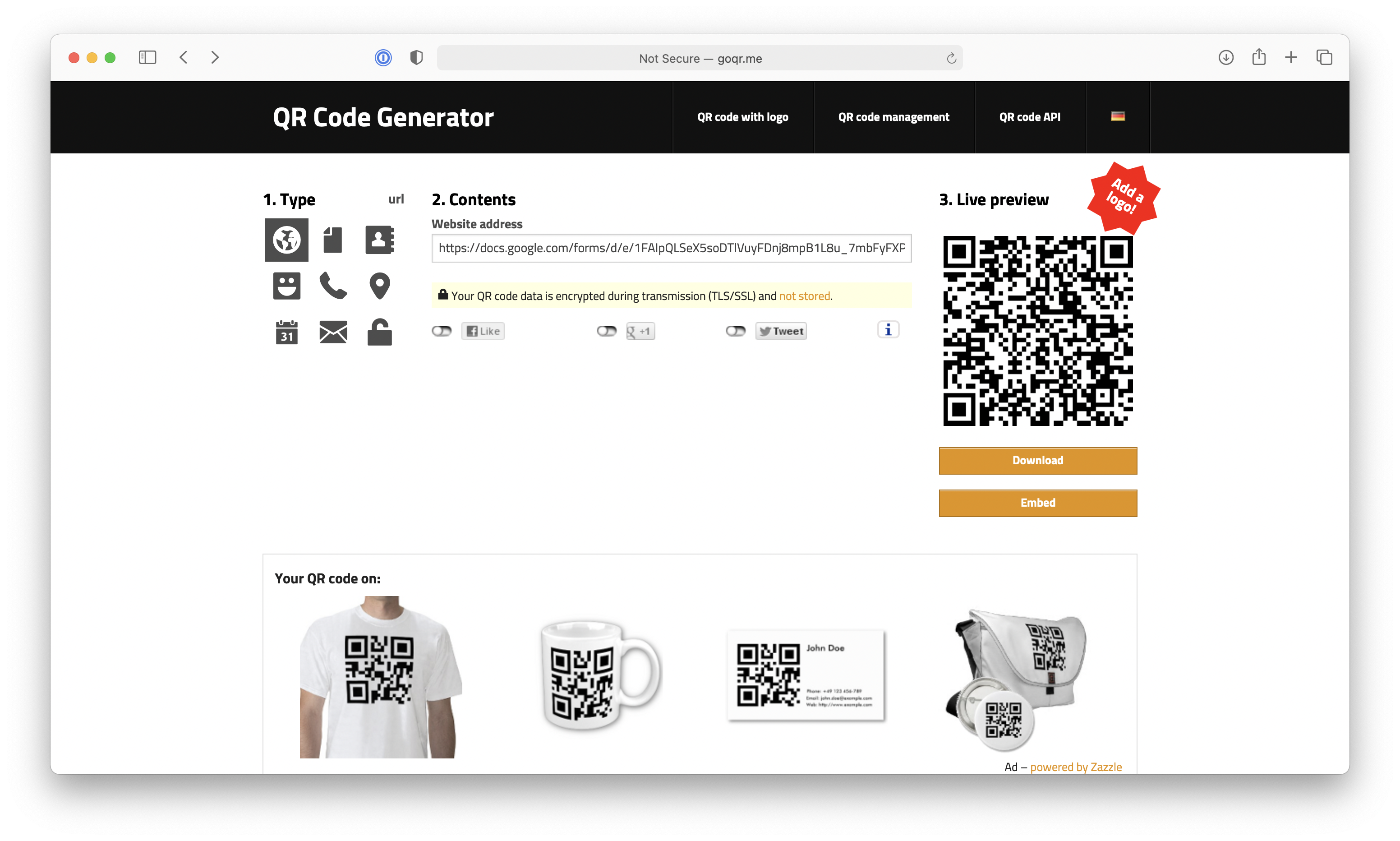 Step two is to copy and paste your Google Forms public link from the send page to the website address field on GoQR.