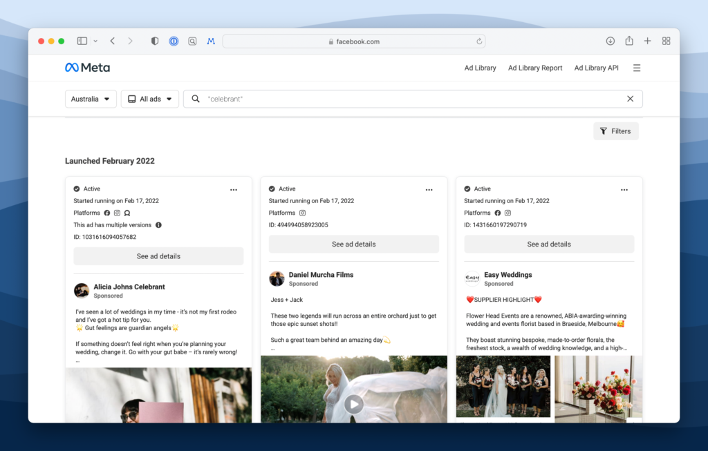 If you’ve been wanting a way to spy on what other people in the wedding industry are doing with their Facebook Ads, here’s a very easy, open, and regulated way to do so.