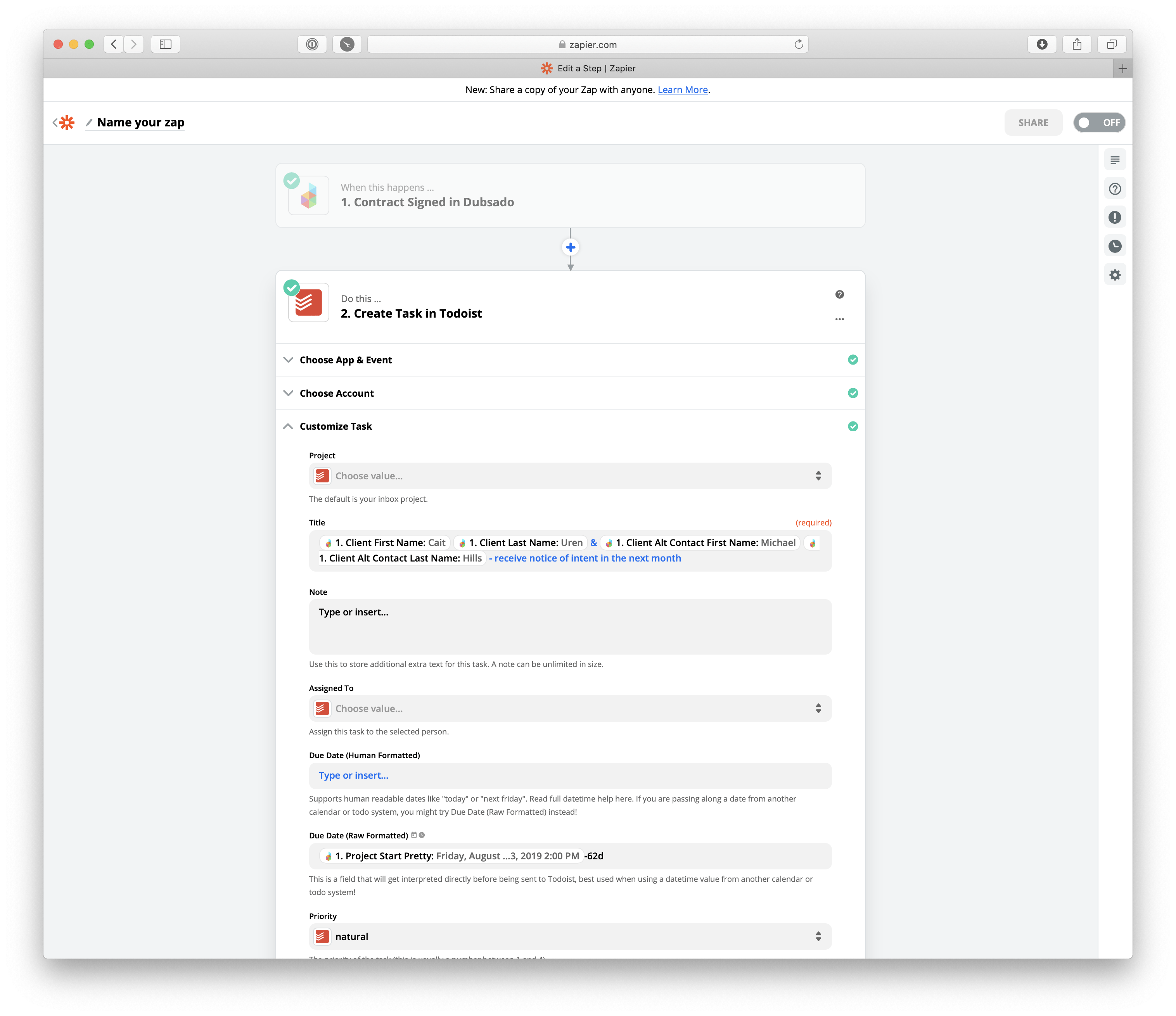 In this example I’ve set a triggering event as a couple signing my contract in Dubsado, and as a result of that trigger event, I’m asking Zapier to create a to-do item in Todoist with the couple’s name and a reminder that I have a month (I’ve put 62 days) to get their NOIM into my filing cabinet.