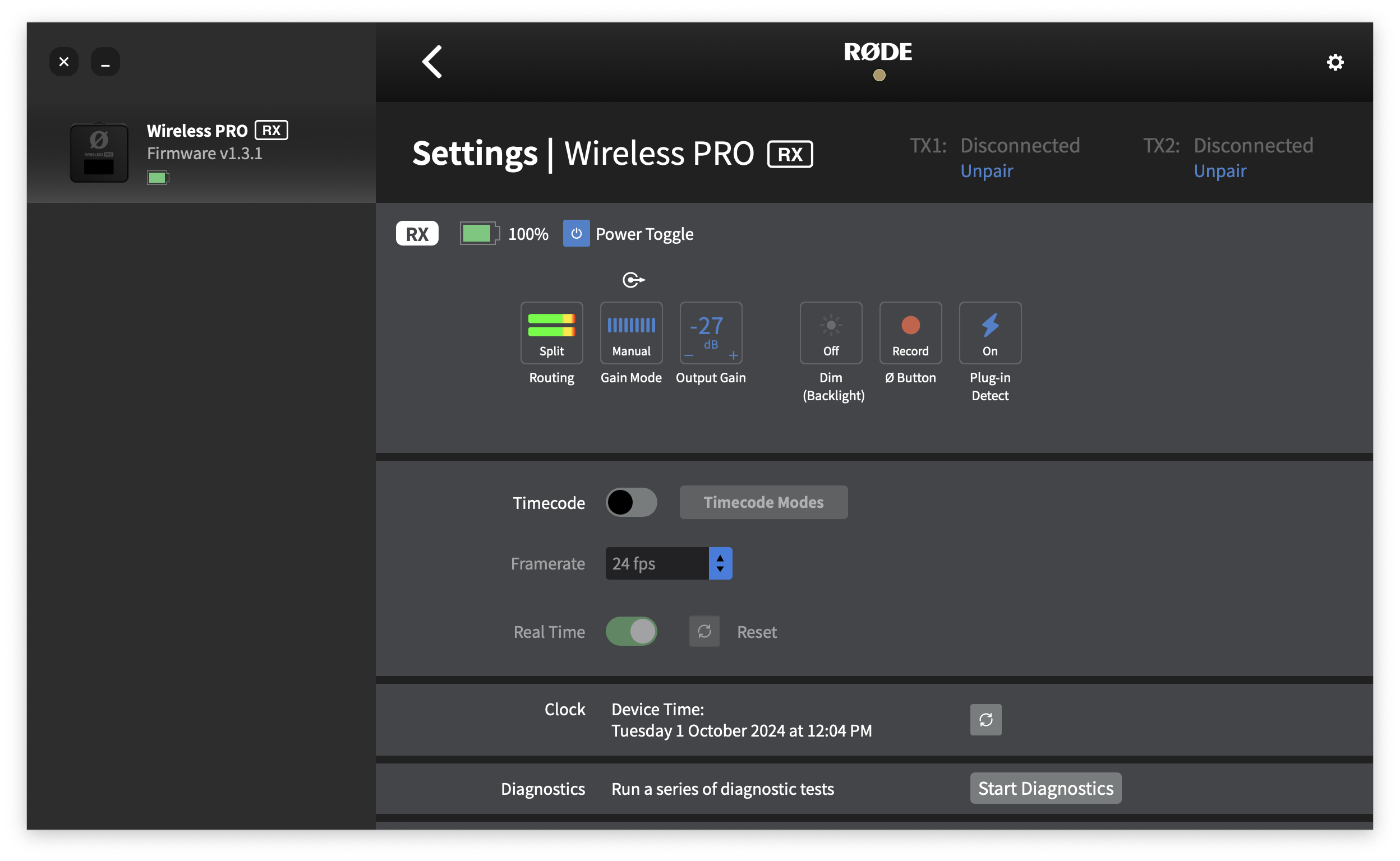 The key to success is plugging the microphone and the receiver into your computer and setting the sensitivity lower and dynamic volume control off. Here are the settings I’m using for the microphone and the receiver. You use the Rode Central application on your computer or phone to configure these settings.