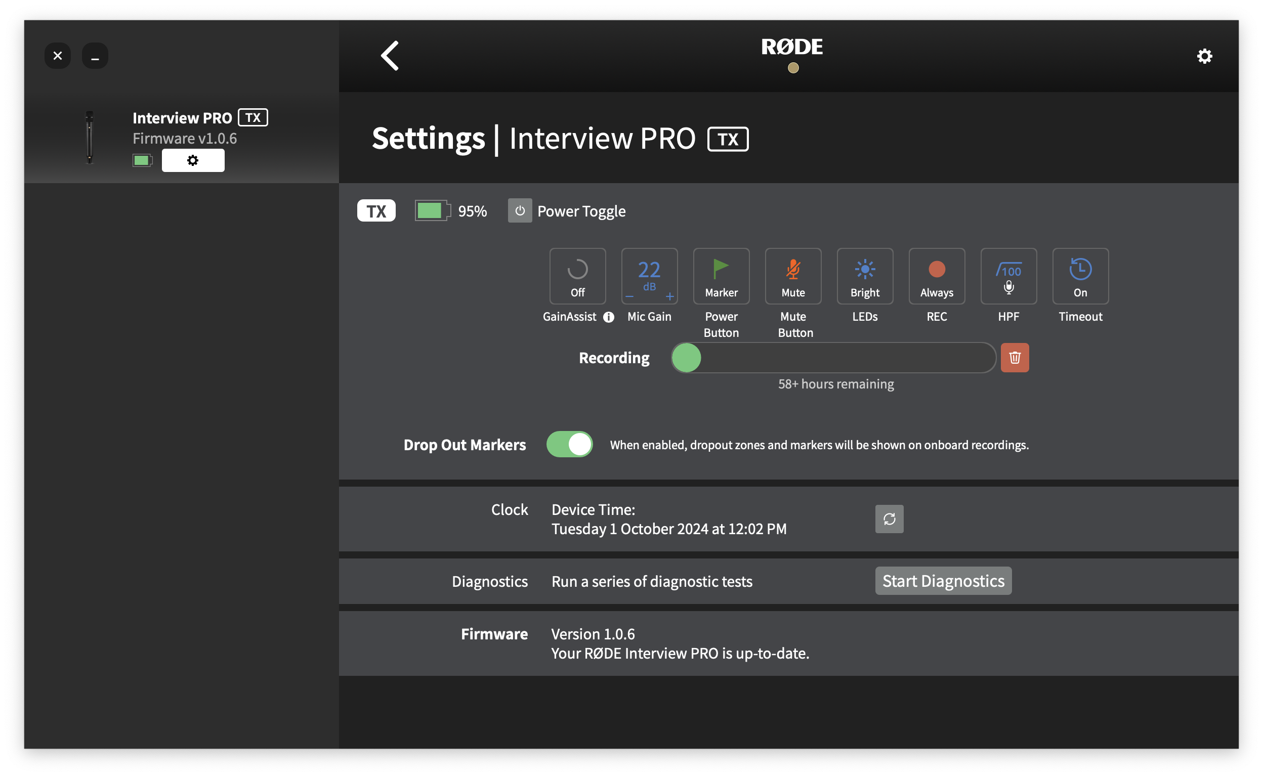 These are the audio settings I am using for the Rode Interview Pro. Note GainAssist is off, mic gain is around 22dB, the high-pass filter is set to 100, and recording is set to always.[/caption]
