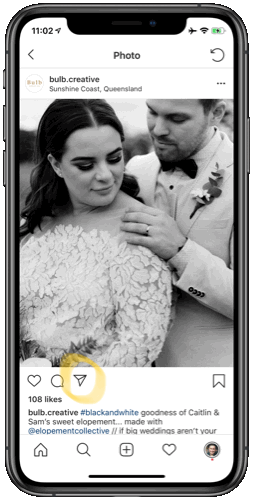 Facebook: On Facebook this means clicking the share button beneath the photographer’s post from their public Facebook Page, named like ‘Josh Withers Wedding Photography’ but not from their personal profile page which might be named ‘Joshua Withers’, if I was a wedding photographer. Tapping the share button means you are sharing their original post with credit given to them already. You can then add an additional caption and you’re welcome to credit them again.