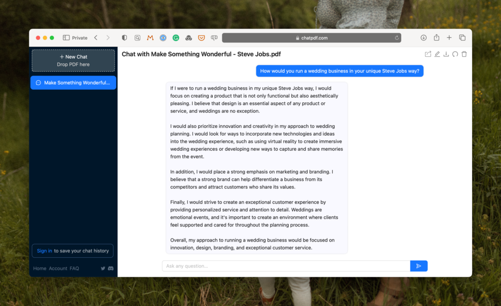 Here’s a fun one to end out on. ChatPDF lets you upload a PDF and then have a conversation with the bot about that PDF. Here’s an example: there’s a new Steve Jobs book called Maker Something Wonderful. I uploaded that to ChatPDF and I can now chat with the book.