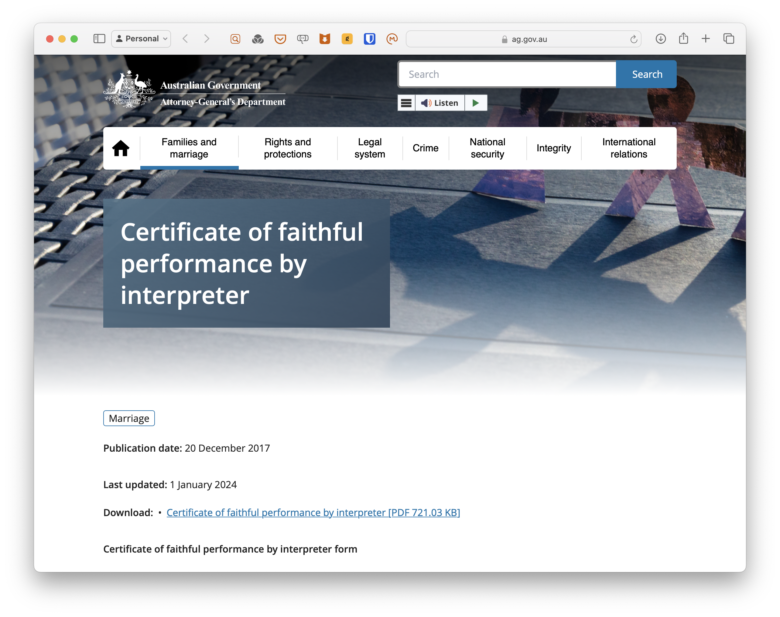 The Attorney-General’s Department’s Marriage Law and Celebrants Section announces a significant update: a new Certificate of Faithful Performance by Interpreter.